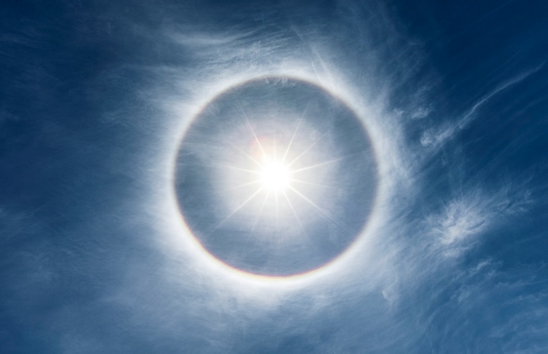 В природе существует такое прекрасное явление, как небесный "нимб" или же гало - световое кольцо вокруг солнца или луны, может быть как белым, так и радужным. Образуется благодаря перисто-слоистым облакам, которые тонкой полупрозрачной пеленой затягивают небо. Мельчайшие кристаллики льда, из которых состоят эти облака, отражают свет и образуют такие светящиеся кольца.